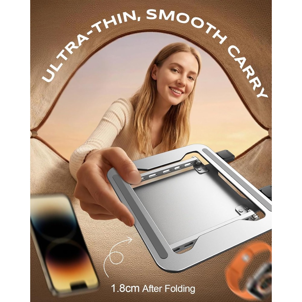 - 【Ultra Slim, Unmatched Portability】Hate bulky laptop stand? Our stand revolutionizes portability, folding down to an incredibly slim 0.7 inches (1.8cm)—thinner than most books. Toss it effortlessly into your backpack, briefcase, or even a large purse. It’s the perfect, always-ready ergonomic companion for work from coffee shops, co-working spaces, or during travel.