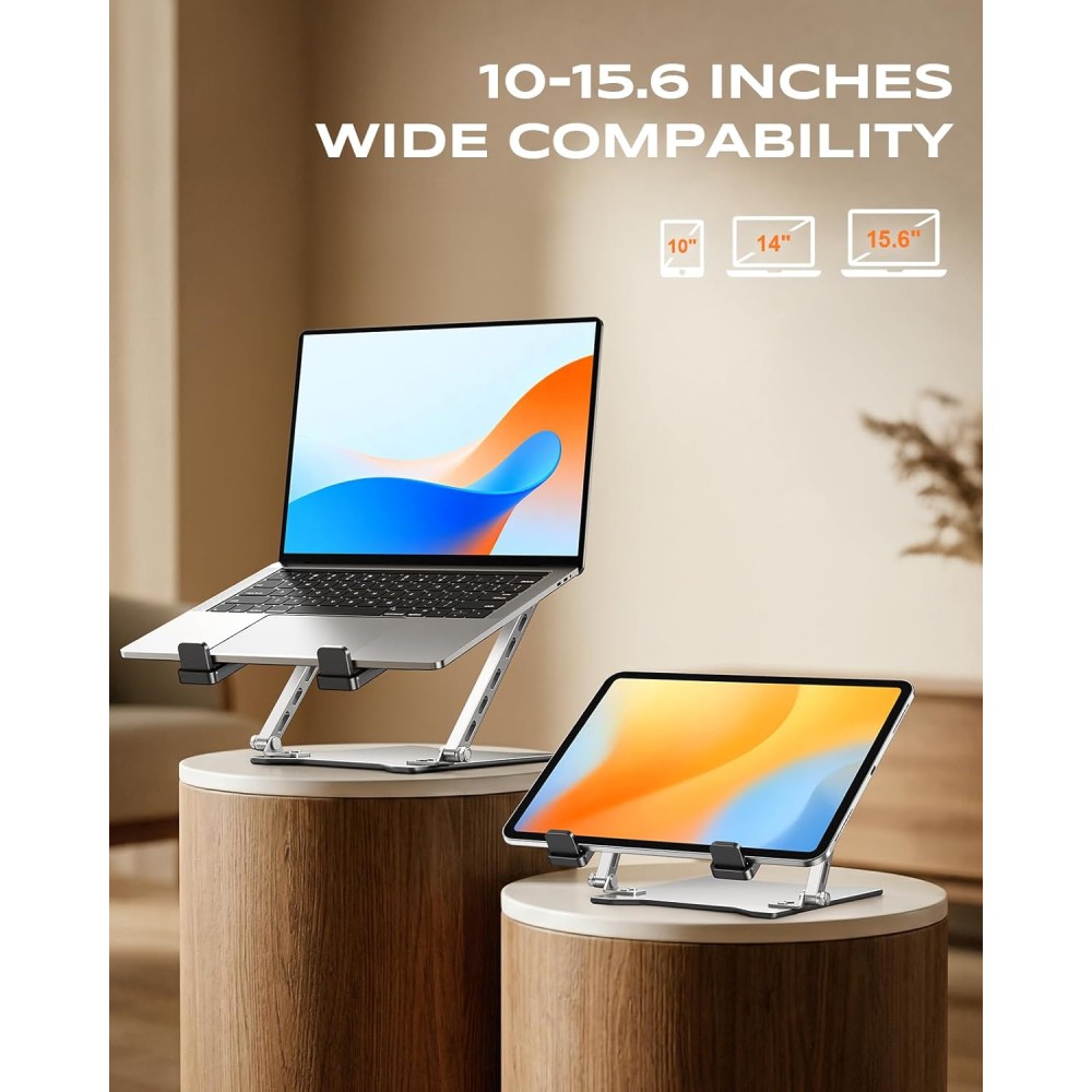 - 【Premium Protection & Durability】Built to last and protect. The smooth panel with silicone strips guards your laptop's underside from scratches, while four non-slip silicone pads keep the computer stand firmly planted on your desk. The reinforced hinge has undergone rigorous testing, guaranteeing a lifespan of over 2,000 adjustments for years of dependable use. For better performance, we recommend using your external keyboard during intense typing.